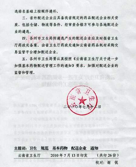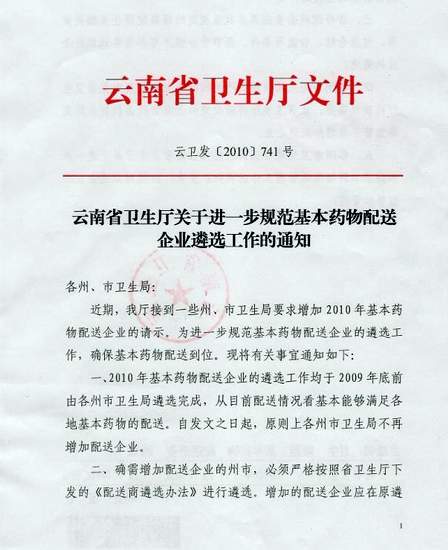 2010年云南省衛(wèi)生廳關(guān)于進一步規(guī)范基本藥物配送企業(yè)遴選工作通知